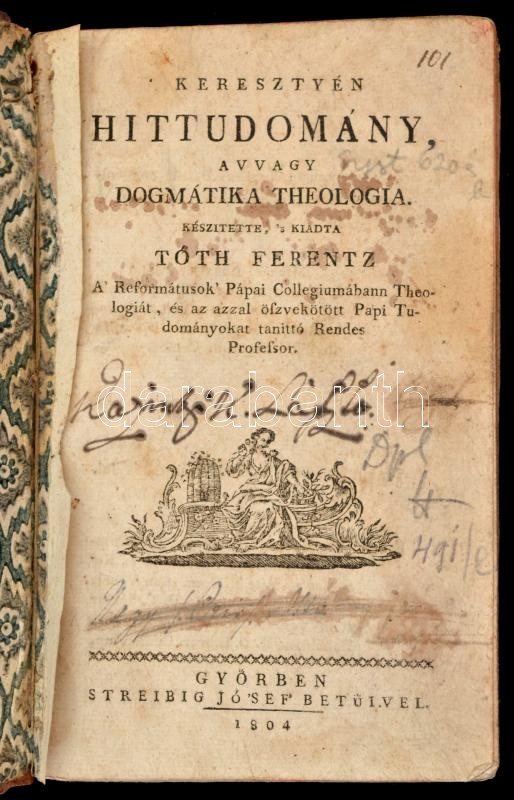 Tóth Ferentz: Keresztyén hittudomány avvagy dogmátika theologia készítette. Készítette, 's kiadta --. Győr, 1804, Streibig József, XX+4+666+10 p. Korabeli félbőr-kötés, kopott borítóval, kopott, sérült gerinccel, a szennylapok hiányoznak, foltos lapokkal, korabeli névbejegyzésekkel.