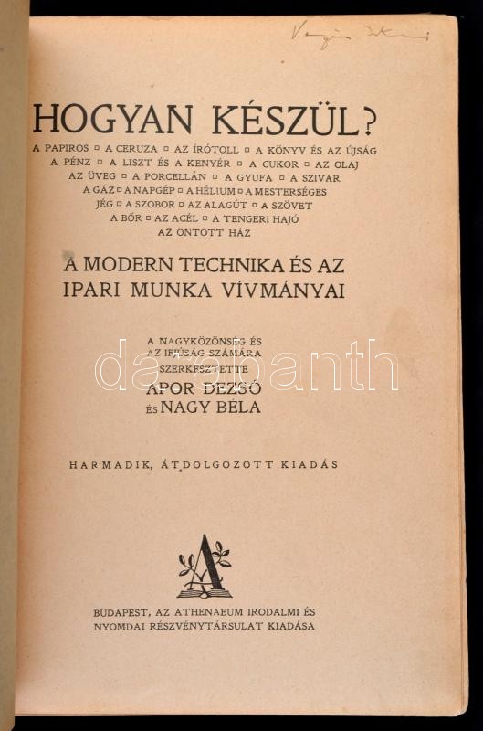 Hogyan készül? A modern technika és az ipari munka vívmányai. Szerk.: Apor Dezső-Nagy Béla. Bp., 1928, Athenaeum, VII+2727 p. Harmadik, átdolgozott kiadás. Fekete-fehér fotókkal illusztrálva. Kiadói aranyozott, festett, egészvászon-kötés, kopott borítóval, az elülső kötéstábla belül megerősített, a VII. és 1. oldal között kissé sérült kötéssel.