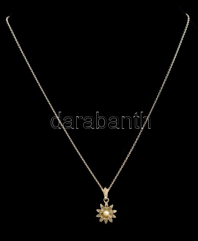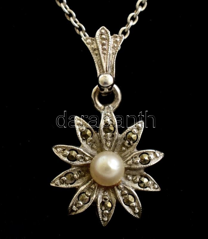 Ezüst(Ag) vékony anker nyaklánc, gyöngyös-markazitos virág függővel, jelzett, h: 40,5 cm, 2,1x1,4 cm, bruttó: 3,2 g