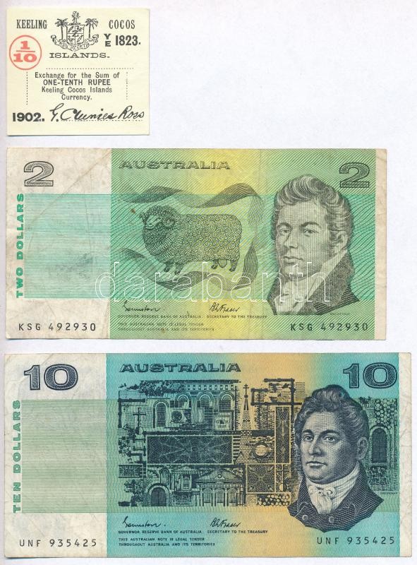 Ausztrália 1985. 2D + 10D + Keeling Cocos Islands 1902. 1/10R modern s... https://www.darabanth.com/de/316-Fernauktion/316.0/Numismatik/Weltweit-Banknoten~2000011/Ausztralia-1985-2D-plus-10D-plus-Keeling-Cocos-Islands-1902-110R-modern-szuksegpenz-TIII-II--Austr~II1738086