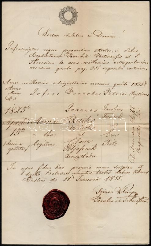 1858 Anyakönyvi kivonat, 15 kr. szignettával, a pesti Ávilai Nagy Szent Teréz plébániatemplom viaszpecsétjével, Klempa Simon (1811-1903) plébános (1854 - 1886) aláírásával