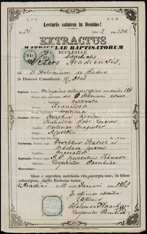 1862 Arad, az óaradi Páduai Szent Antal-plébánia keresztelési anyakön... https://www.darabanth.com/de/317-Fernauktion/317.0/Andere-Sammelgebiete/Dokument~20/1862-Arad-az-oaradi-Paduai-Szent-Antal-plebania-keresztelesi-anyakonyvi-kivonata-latin-nyel~II1746116
