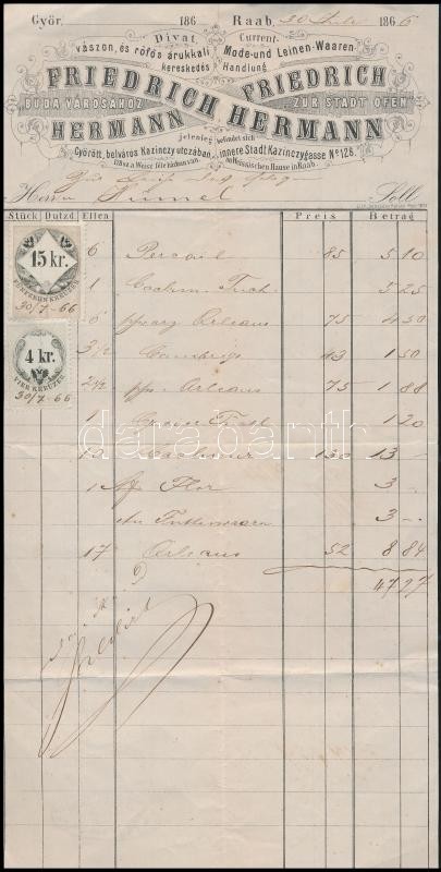 Beschreibung: 1866 Győr (Raab), Friedrich Hermann győri divatkereskedő rézmetszéses díszes fejléces számlája, 15 + 4 kr okmánybélyegekkel, szép állapotban