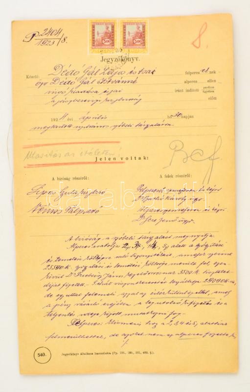 Beschreibung: 1924 Bírósági jegyzőkönyv, inflációs illletékbélyegekkel (62 db 500 k.), aláírásokkal