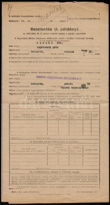 Beschreibung: 1944 Kölcsönkötvény bejelentéséről szóló ív a Persil Kft. részére