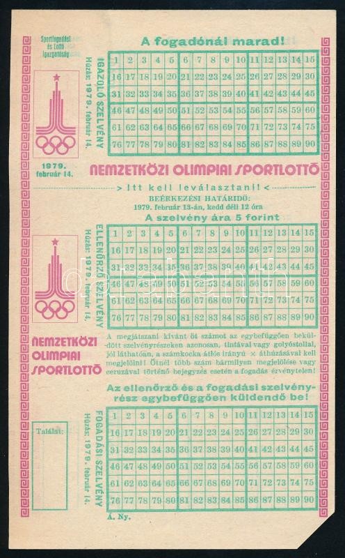1979 Nemzetközi Olimpiai Sportlottó, üres lottószelvény https://www.darabanth.com/de/317-Fernauktion/317.0/Andere-Sammelgebiete/Dokument~20/1979-Nemzetkozi-Olimpiai-Sportlotto-ures-lottoszelveny~II1744226