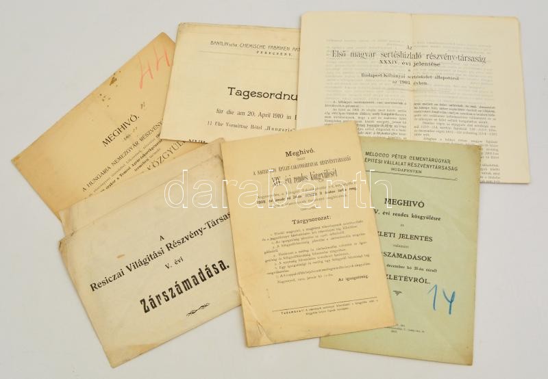 1903-1917 6 db különböző zárszámadás (Nagyenyedi Épület-Lakatosárugyár Részvénytérsaság, Hungaria Nemezgyár, Első Magyar Sertéshizlaló Részvénytársaság, Melocco Péter Cementárugyár és Építési Vállalat Részvénytársaság, stb.)