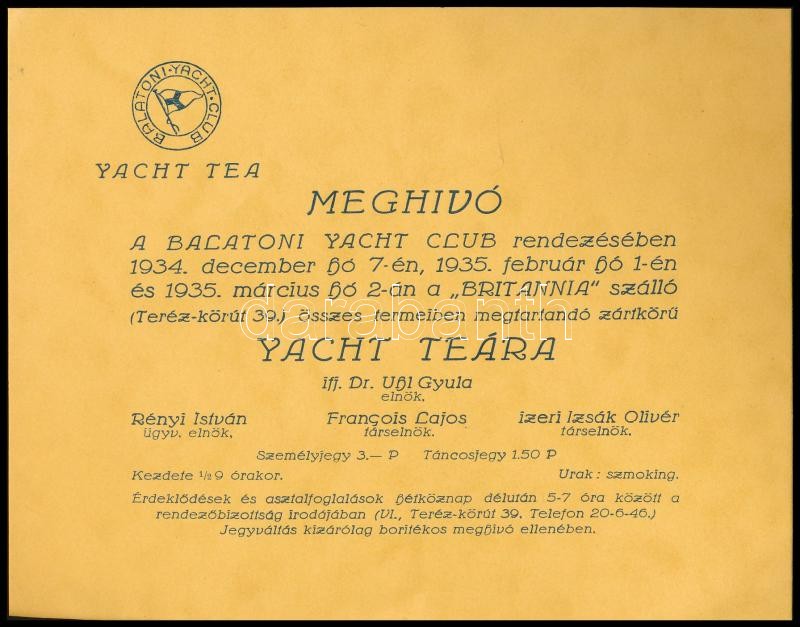 1934-1935 Meghívó a Balatoni Yacht Club teájára a Britannia Szállóba https://www.darabanth.com/de/317-Fernauktion/317.0/Andere-Sammelgebiete/Drucksachen~31/1934-1935-Meghivo-a-Balatoni-Yacht-Club-teajara-a-Britannia-Szalloba~II1746919