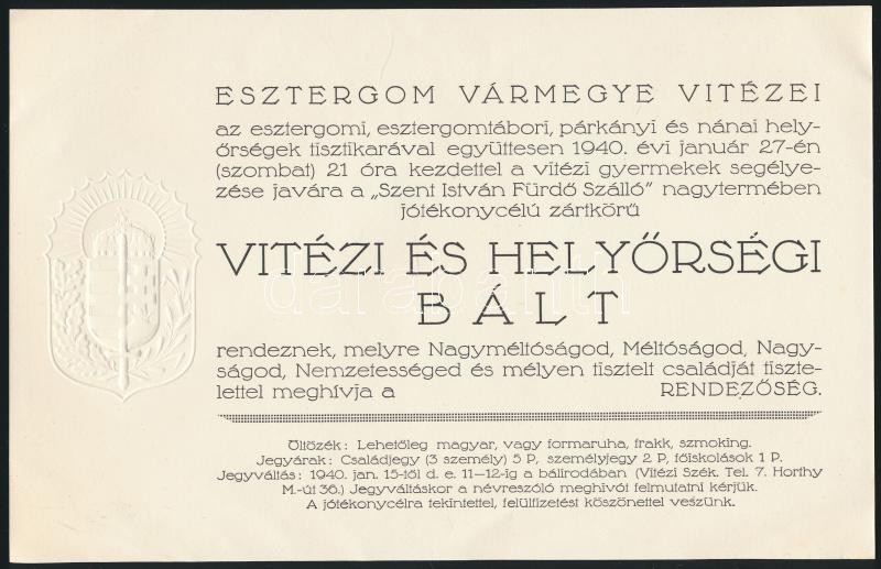 Beschreibung: 1940 Meghívó az Esztergomi Vármegye Vitézei által rendezett vitézi és helyőrségi bálra