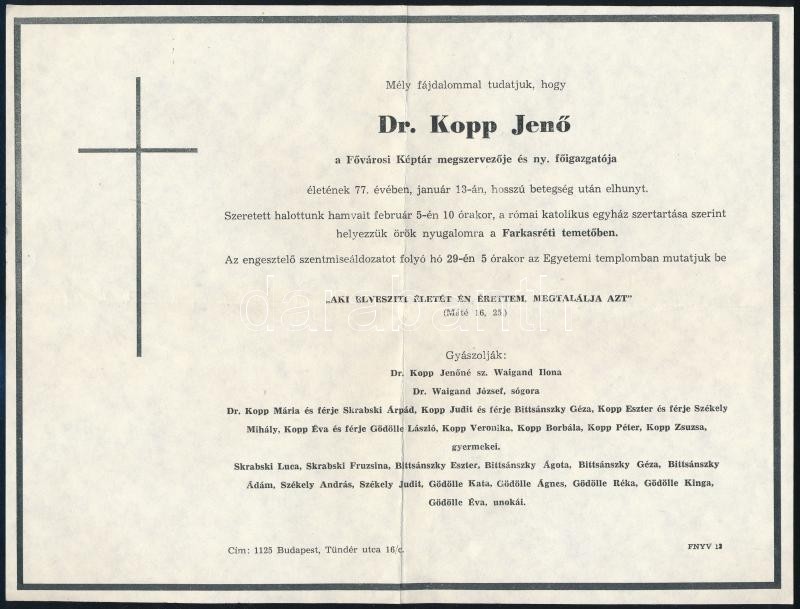 1977 Dr. Kopp Jenő (1900-1977): művészettörténész,(0 részt vett a Fővárosi Képtár alapításában,majd annak vezetője (1935-1948),) halálozási értesítője.