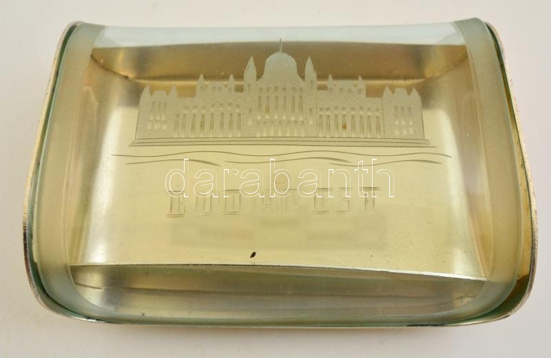 Beschreibung: Fém "Budapest" feliratú névjegykártyatartó, homokfújt üveg Országházzal képpel, jó állapotban, 13×9 cm