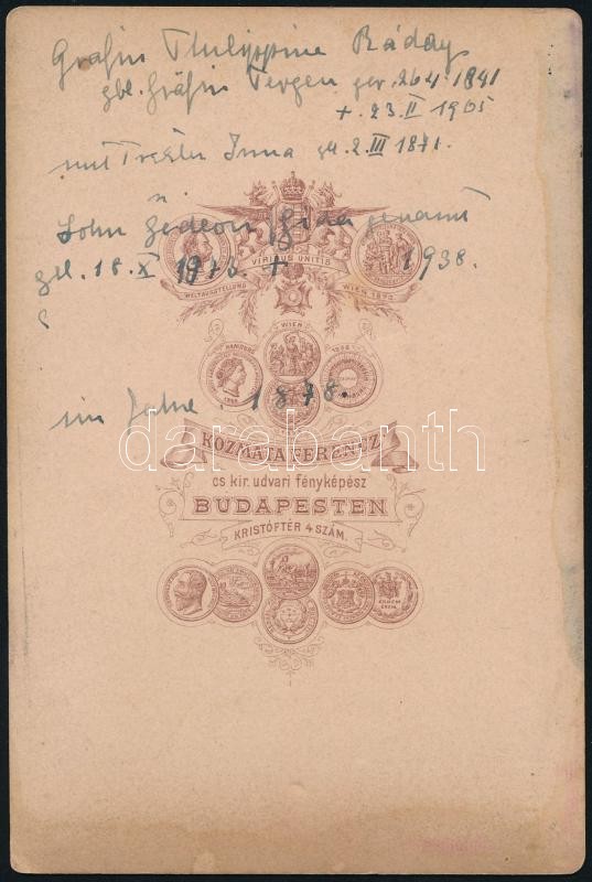 1878 A Ráday-család műtermi fotója, köztük Ráday Gedeon (1872-1937) későbbi belügyminiszter, Kozmata Ferenc műterméből, hátoldalán feliratozva, kartonra kasírozva, 16,5x11 cm
