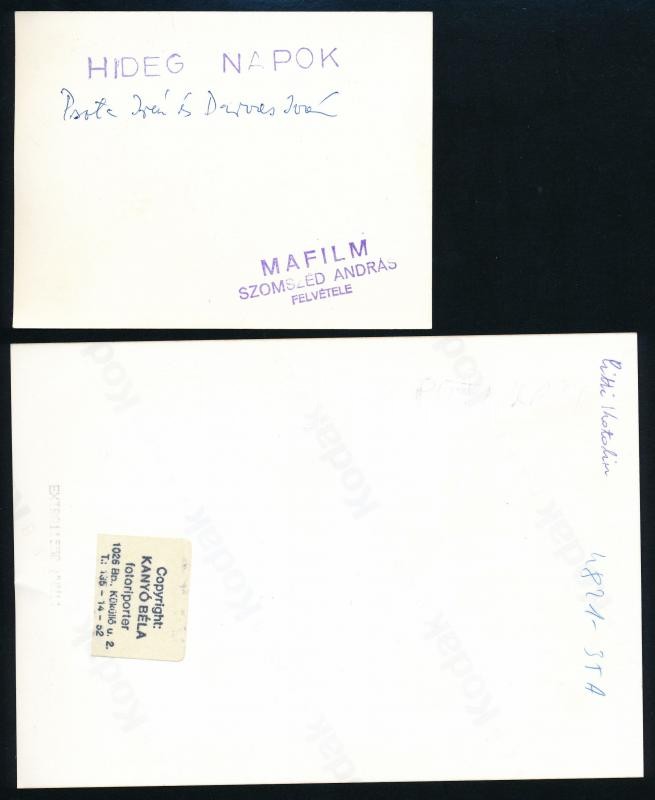 Beschreibung: 2 db filmfotó: Pitti Katalin, Psota Irén, Darvas Iván, hátuljukon feliratozva, pecséttel jelzett, különböző méretben