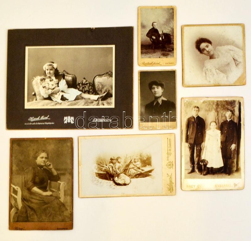 Magyar fotótörténeti tétel. Különféle fotósok műtermeiből származó kabinetfotók. Kolozsvár, Kézdivásárhely, Mosonmagyaróvár, Sátolajaújhely, Budapest, összesen 7 fotó