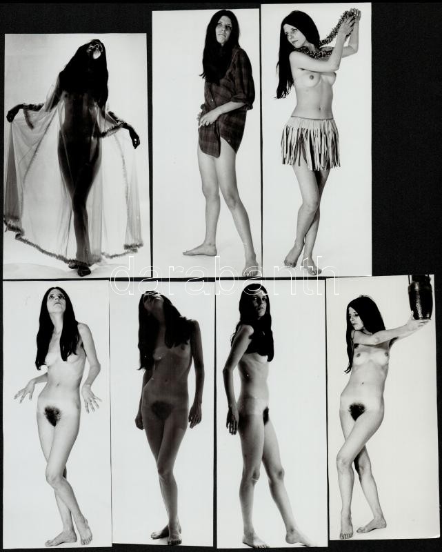 Beschreibung: cca 1974 Kalapos aranyos, 8 db szolidan erotikus fotó, hét vintage, egy mai nagyítás, 25x18 cm és 16x9,5 cm között