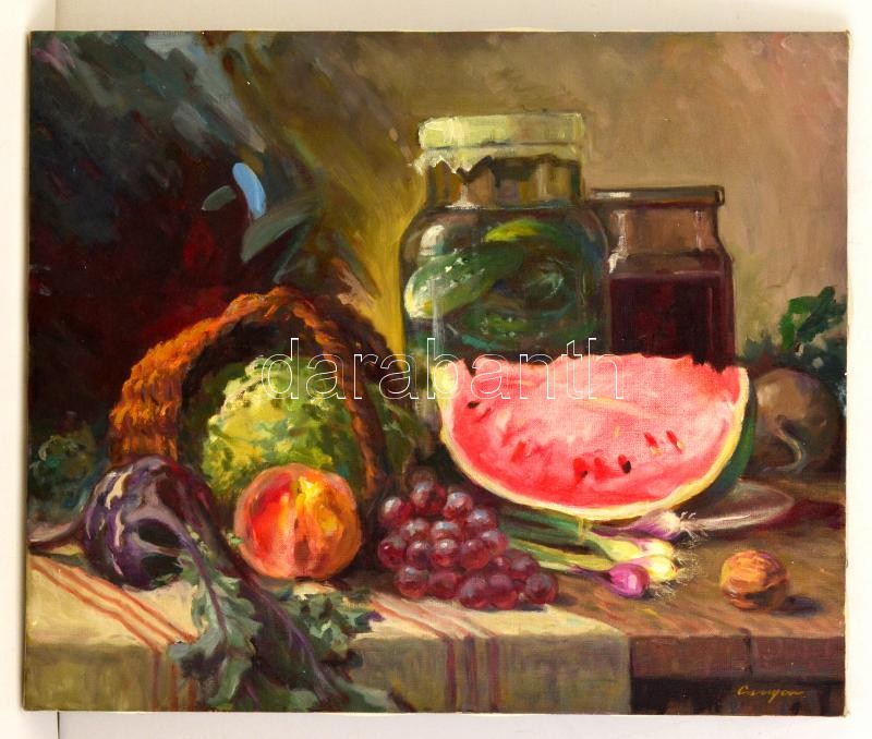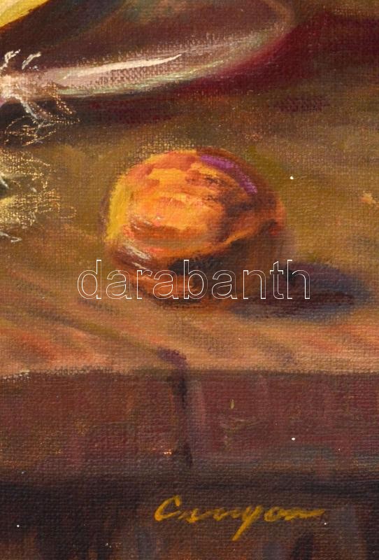 Beschreibung: Csongor József (1913-1981): Asztali csendélet. Olaj, vászon, jelzett, 50×60 cm