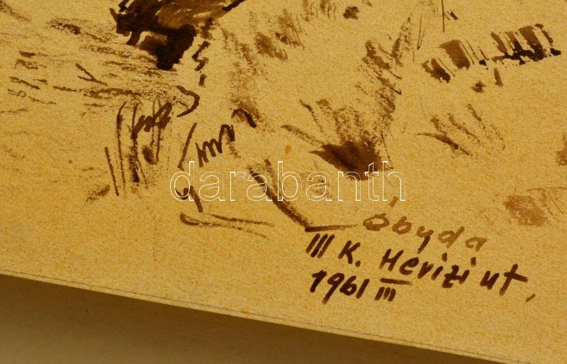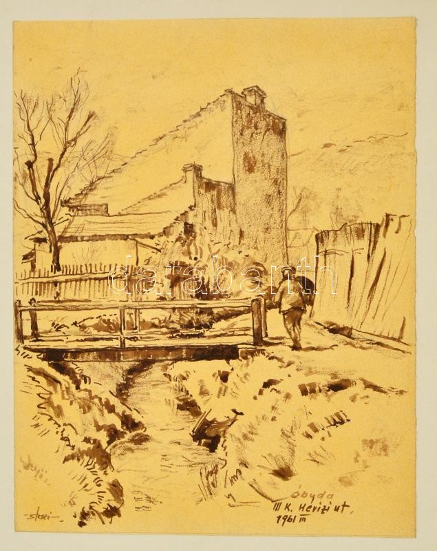 Beschreibung: Sostarics Lajos (1896-1968): Óbuda, Hévízi út, tus, papír, jelzett, kartonra ragasztva, 28×22 cm