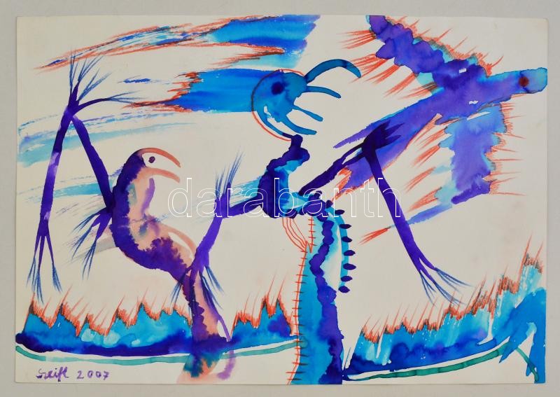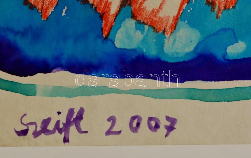 Beschreibung: Szeift Béla (1944-2012): Alkalmi madárijesztő. Akvarell, papír, jelzett, 30×42 cm