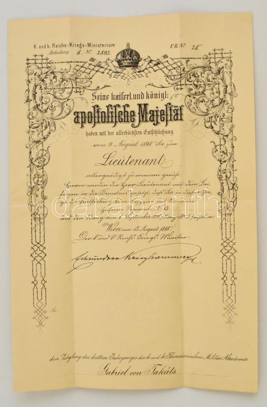 Beschreibung: 1898 péteri Takáts Gábor (1877-1914) később Limanovánál hősi halált halt huszárkapitány hadnagyi kinevezése a cs. és kir. 13. huszárezredhez