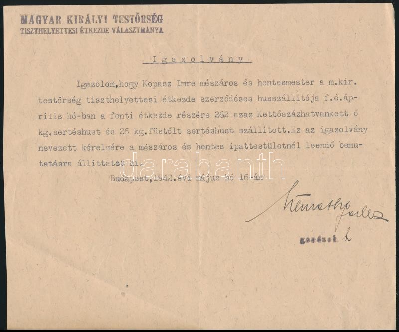 Beschreibung: 1942 a Magyar Királyi Testőrség Tiszthelyettesi Étkezde Választmánya igazolása Kopasz Imre mészáros részére húsbeszállításról, gondnoki aláírással