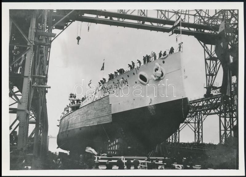 A Szent István csatahajó vízre bocsátása 1914-ben, a Ganz-Danubius fiumei hajógyárában, az 1980-as években eredeti negatívról előhívott másolat, 13x18 cm