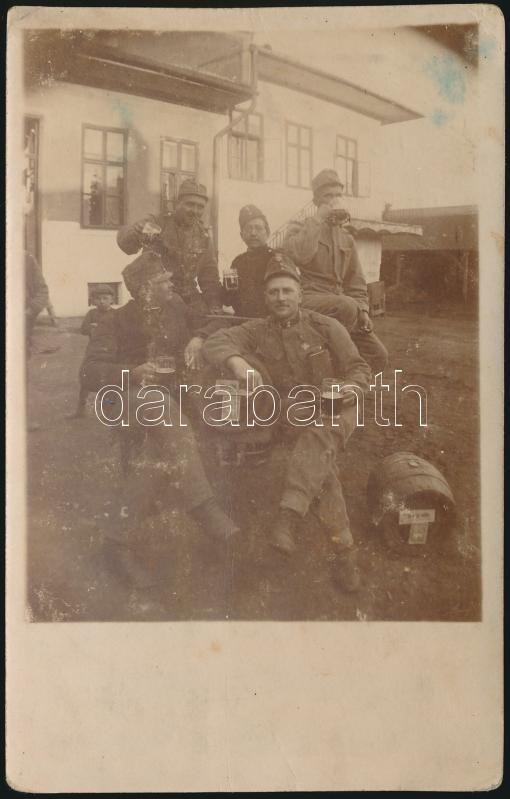 cca 1916 A Király-sört hordóra verő katonák a harc szünetében, fotólap... https://www.darabanth.com/de/317-Fernauktion/317.0/Andere-Sammelgebiete/Militaria~29/cca-1916-A-Kiraly-sort-hordora-vero-katonak-a-harc-szuneteben-fotolap-14x9-cm~II1745393