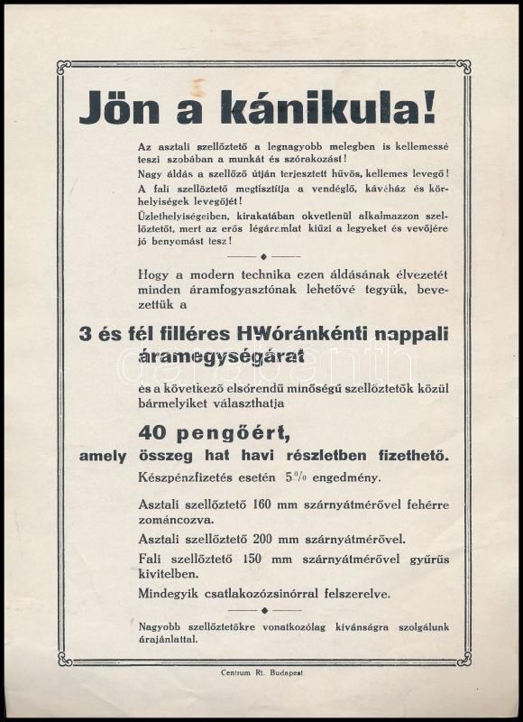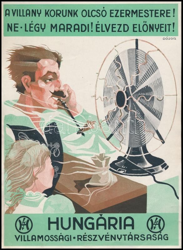 1926 A Hungária Villamossági Részvénytársaság ventilátort reklámozó ki... https://www.darabanth.com/de/317-Fernauktion/317.0/Andere-Sammelgebiete/Poster~32/1926-A-Hungaria-Villamossagi-Reszvenytarsasag-ventilatort-reklamozo-kisplakatja-Gozon-gr~II1745140