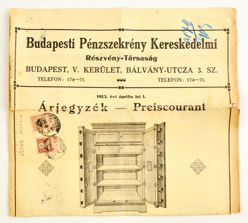 Beschreibung: 1913 a Budapesti Pénzszekrény Kereskedelmi Rt. árjegyzéke, illusztrációkkal, kissé megviselt állapotban, illetékbélyeggel