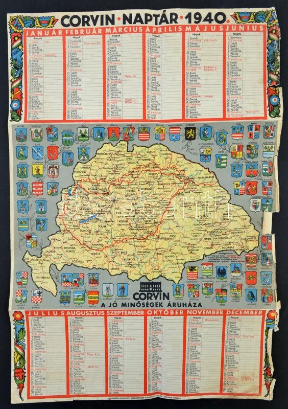 1940 Corvin Naptár, rajta Nagymagyarország térképével, benne Csonka-Magyarország és a visszatért területek határaival, címerekkel, szakadozott széllel, hajtásnyommal, térkép: 23x33 cm, 48x33 cm.