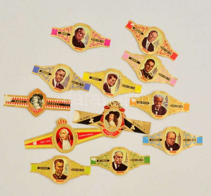 Régi szivargyűrű gyűjtemény, 12 db, ismert emberek arcképeivel (Churchill, De Gaulle, Kennedy, Johnson, Adenauer, Albert Schweitzer...stb.) / Cigar rings, 12 pc., with portraits of known persons( Churchill, De Gaulle, Kennedy, Johnson, Adenauer, Albert Schweitzer...etc.)