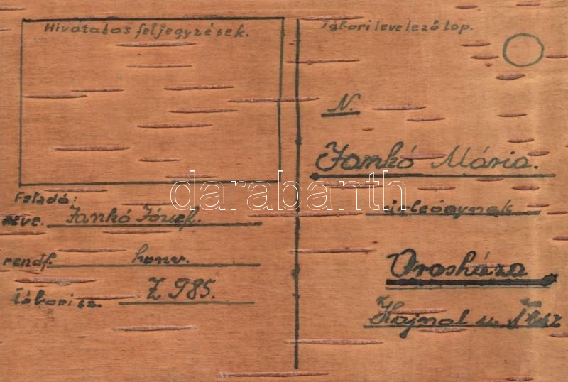 Beschreibung: 1944 Emlékül az orosz harctérről Jankó Józseftől (Honvéd Z985.). Nyírfa tábori levelezőlap / WWII Hungarian military field post. Birchwood postcard