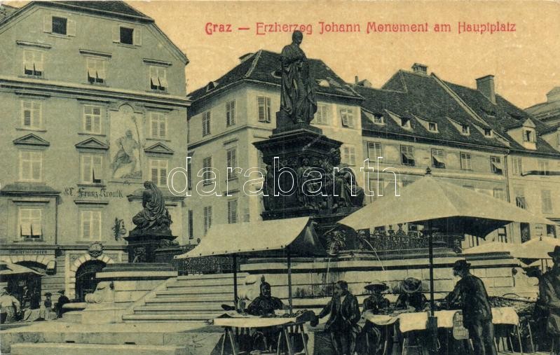 Beschreibung: Graz, Erzherzog Johann Monument am Hauptplatz, Franz Kroath Materialwaren / main square, monument, market vendors, shop. W.L. 2263. (EK)