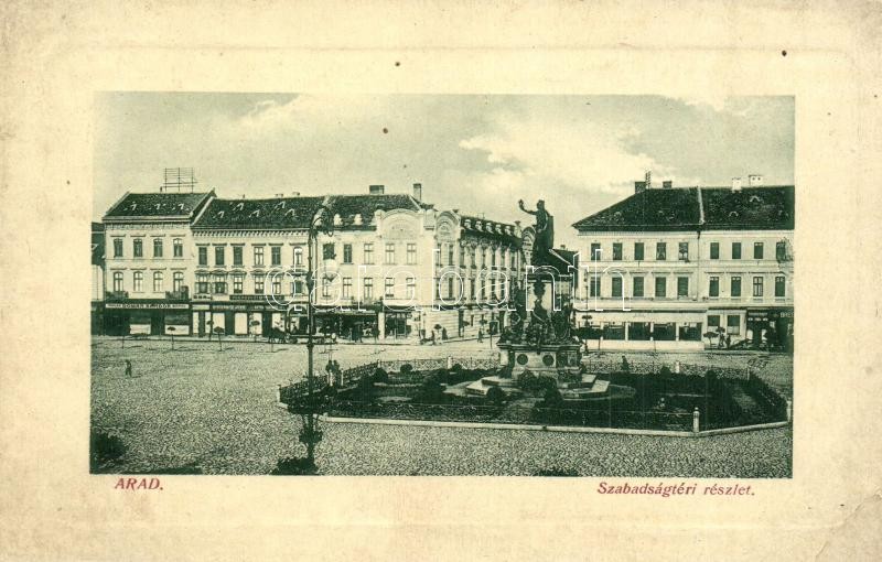 Arad, Szabadság tér, Domán Sándor, Winternitz Jenő, Rothstein Mór, Pohm János üzlete, Pölzl kávéház, Fogorvosi műterem. W. L. Bp. 232. Mandl Ignác kiadása / square, shops, café, dentistry (EK)
