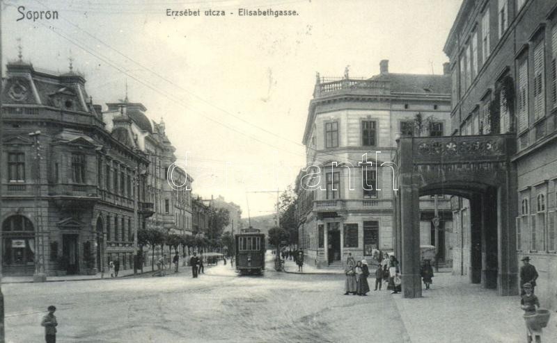 Sopron, Erzsébet utca, villamos, Újhelyi ház (vágott / cut) https://www.darabanth.com/de/317-Fernauktion/317.0/Ansichtskarten/Ungarn~1000004/Sopron-Erzsebet-utca-villamos-Ujhelyi-haz-vagott-cut~II1744297
