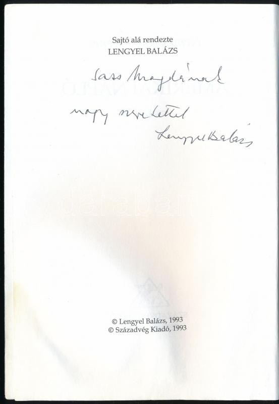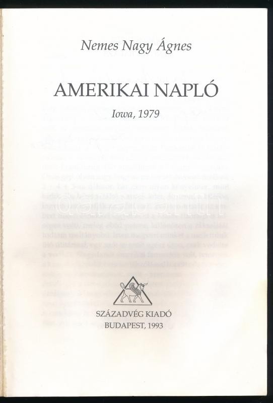 Nemes Nagy Ágnes: Amerikai napló. Iowa, 1979. Sajtó alá rendezte Lengyel Balázs. Bp.,1993, Századvég. Kiadói papírkötés. Első kiadás. A szerkesztő, az író volt férje, Lengyel Balázs (1918-2007) író, kritikus által dedikált.