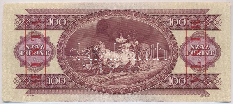 1975. 100Ft "B000-000887" sorozat- és sorszámmal, illetve "MINTA" felülnyomással és perforációval, nyomdai festékfolttal és papírránccal T:I