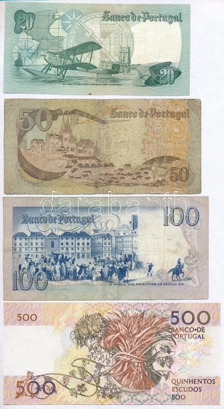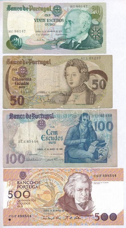 Portugal 1978. 20 Escudos + 1980. 50 Escudos + 1985. 100 Escudos + 1993. 500 Escudos C:XF-VG