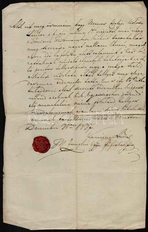 1837 Berettő (ma Bracovce, Szlovákia), Kazinczy András (1803-1875) Zemplén vármegye főispánjának magyar nyelvű oklevele vármegyei ügyben, családi címeres pecséttel