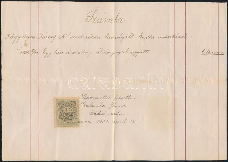 1901 Komárom, Komáromi (Felvidék) kádármester számlája 2f okmánybélyeg... https://www.darabanth.com/de/318-Fernauktion/318.0/Andere-Sammelgebiete/Dokument~16/1901-Komarom-Komaromi-Felvidek-kadarmester-szamlaja-2f-okmanybelyeggel~II1755079