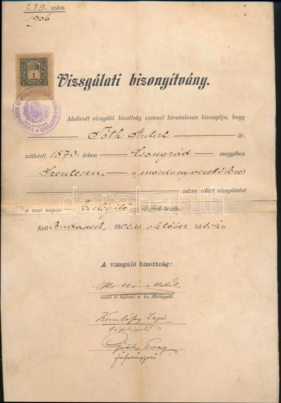1906 Bp., Vizsgálati bizonyítvány mozdonyvezető számára okmánybélyegge... https://www.darabanth.com/de/318-Fernauktion/318.0/Andere-Sammelgebiete/Dokument~16/1906-Bp-Vizsgalati-bizonyitvany-mozdonyvezeto-szamara-okmanybelyeggel~II1755887