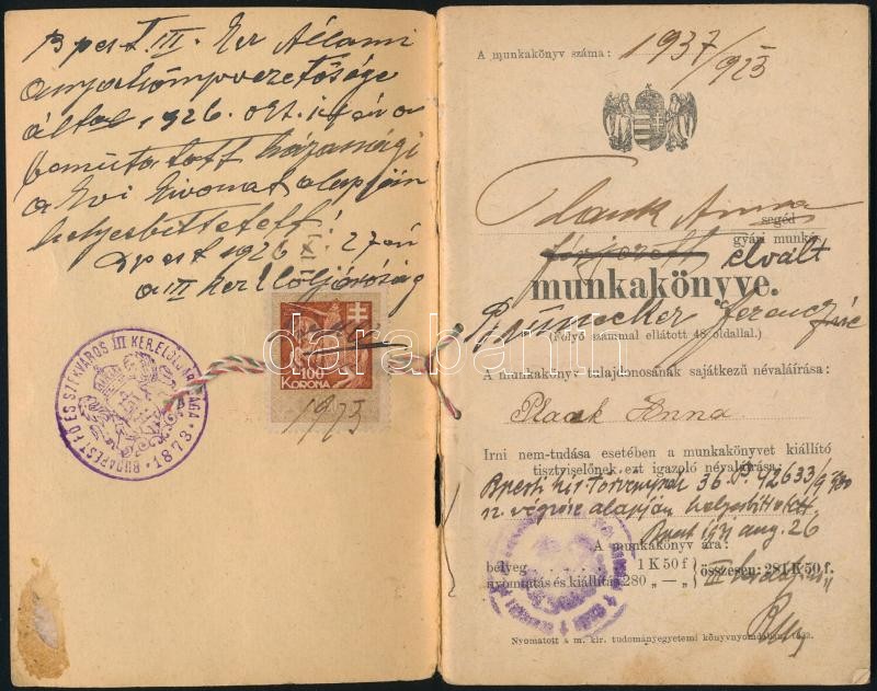 1925 Bp., Munkakönyv bejegyzésekkel, okmánybélyeggel https://www.darabanth.com/de/318-Fernauktion/318.0/Andere-Sammelgebiete/Dokument~16/1925-Bp-Munkakonyv-bejegyzesekkel-okmanybelyeggel~II1756199