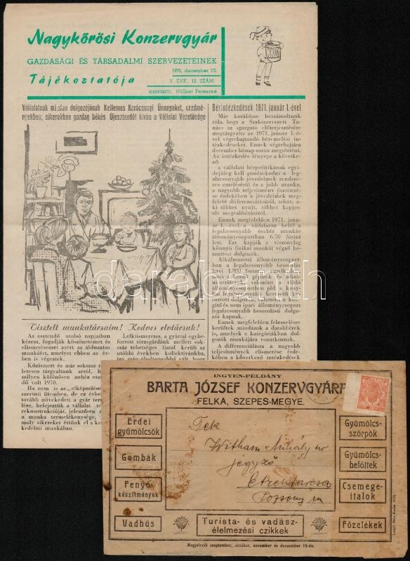 Beschreibung: cca 1910-1970 Barta József Konzervgyára (Felka, Szepes vm.) reklámlapja + a Nagykőrösi Konzervgyár tájékoztató lapja (5. évf. 12.)