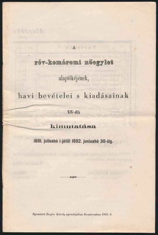 1882 A révkomáromi nőegylet alaptőkéjének, havi bevételei s kiadásaina... https://www.darabanth.com/de/318-Fernauktion/318.0/Andere-Sammelgebiete/Drucksachen~29/1882-A-revkomaromi-noegylet-alaptokejenek-havi-bevetelei-s-kiadasainak-XIV-dik-kimutatasa-~II1755198