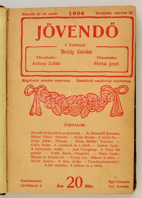 1904 Jövendő. II. évf. 12-15. sz. Szerk.: Bródy Sándor. Főmunkatárs Ambrus Zoltán, Heltai Jenő. Korabeli átkötött félvászon-kötés, a borítója és a gerince kopott, a gerince sérült, a hátsó szennylapnál foltos.