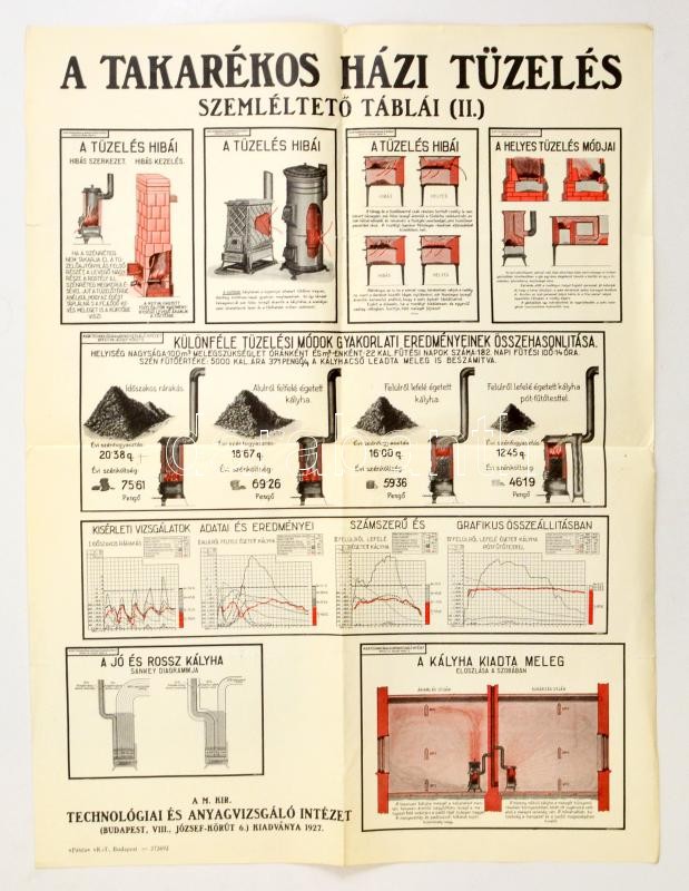 Beschreibung: 1927 Bp., A M. Kir. Technológiai és Anyagvizsgáló Intézet által kiadott takarékos házi tüzelésről szóló szemléltető plakát, hajtott, 63x47 cm