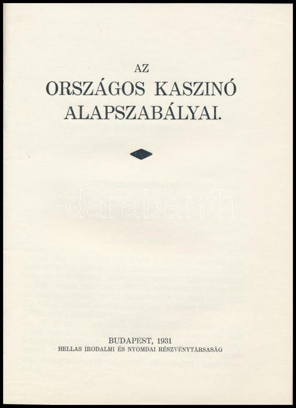 1931 Az Országos Kaszinó alapszabályai. Bp., Hellas. Tűzött papírkötés... https://www.darabanth.com/de/318-Fernauktion/318.0/Andere-Sammelgebiete/Drucksachen~29/1931-Az-Orszagos-Kaszino-alapszabalyai-Bp-Hellas-Tuzott-papirkotesben-20-p~II1748492