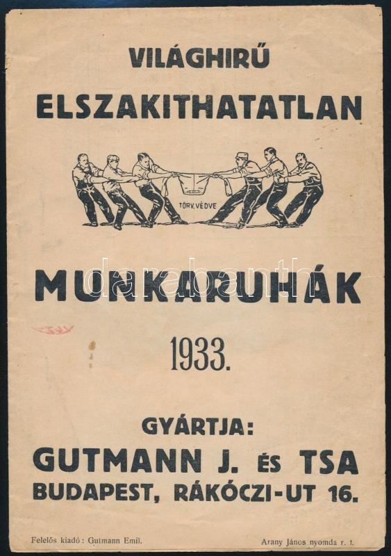 1933 Gutmann J. és Tsa, világhírű elszakíthatatlan munkaruhák. Bp., A... https://www.darabanth.com/de/318-Fernauktion/318.0/Andere-Sammelgebiete/Drucksachen~29/1933-Gutmann-J-es-Tsa-vilaghiru-elszakithatatlan-munkaruhak-Bp-Arany-Janos-ny~II1757228