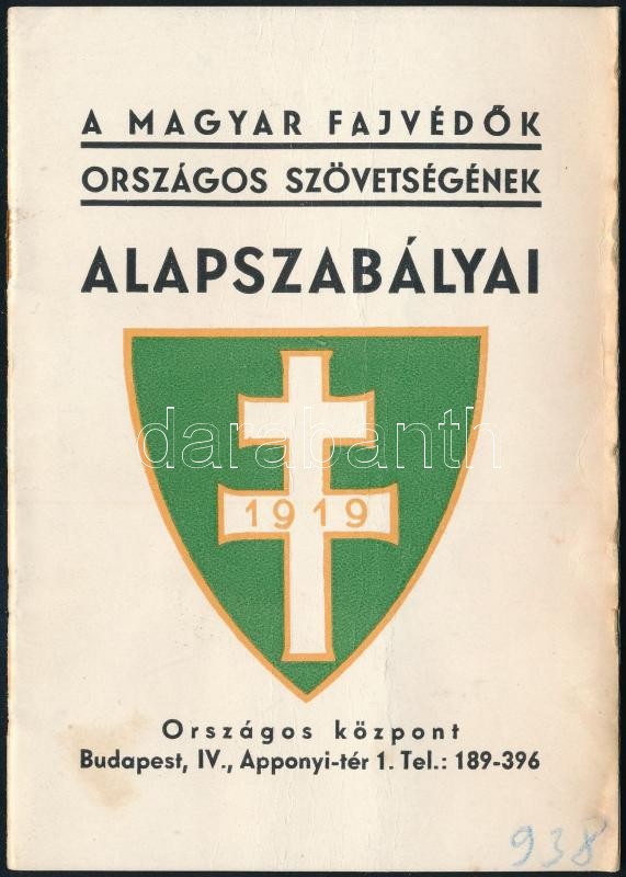 1938 Bp., A Magyar Fajvédők Országos Szövetségének alapszabályai, 23p https://www.darabanth.com/de/318-Fernauktion/318.0/Andere-Sammelgebiete/Drucksachen~29/1938-Bp-A-Magyar-Fajvedok-Orszagos-Szovetsegenek-alapszabalyai-23p~II1754824