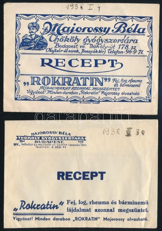 1938 Majorossy Béla Thököly gyógyszertárának két borítékja, (Bp., Thök... https://www.darabanth.com/de/318-Fernauktion/318.0/Andere-Sammelgebiete/Drucksachen~29/1938-Majorossy-Bela-Thokoly-gyogyszertaranak-ket-boritekja-Bp-Thokoly-Majtsar-ut-sa~II1757238