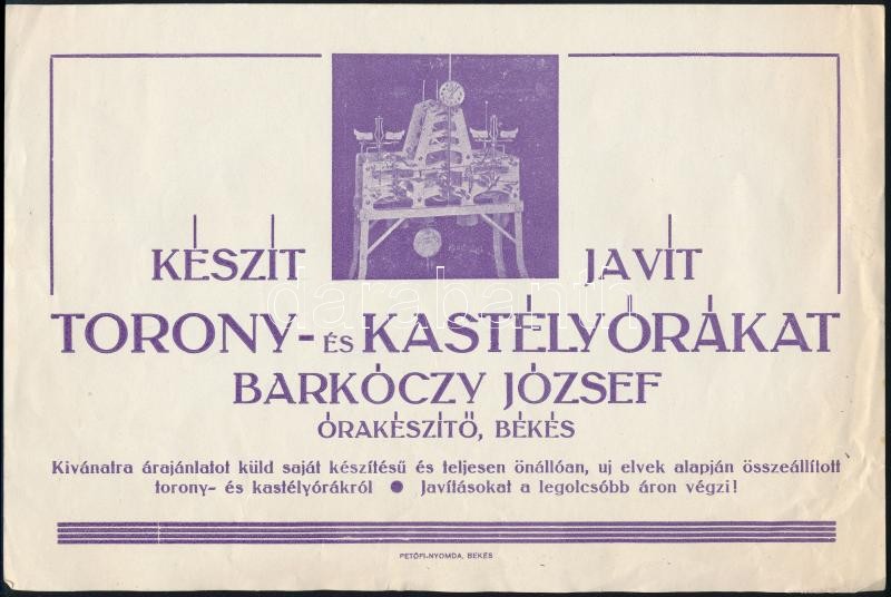 cca 1920-1930 Békés, Barkóczy József torony- és kastélyórakészítő rekl... https://www.darabanth.com/de/318-Fernauktion/318.0/Andere-Sammelgebiete/Drucksachen~29/cca-1920-1930-Bekes-Barkoczy-Jozsef-torony-es-kastelyorakeszito-reklamos-szorolapja~II1754876